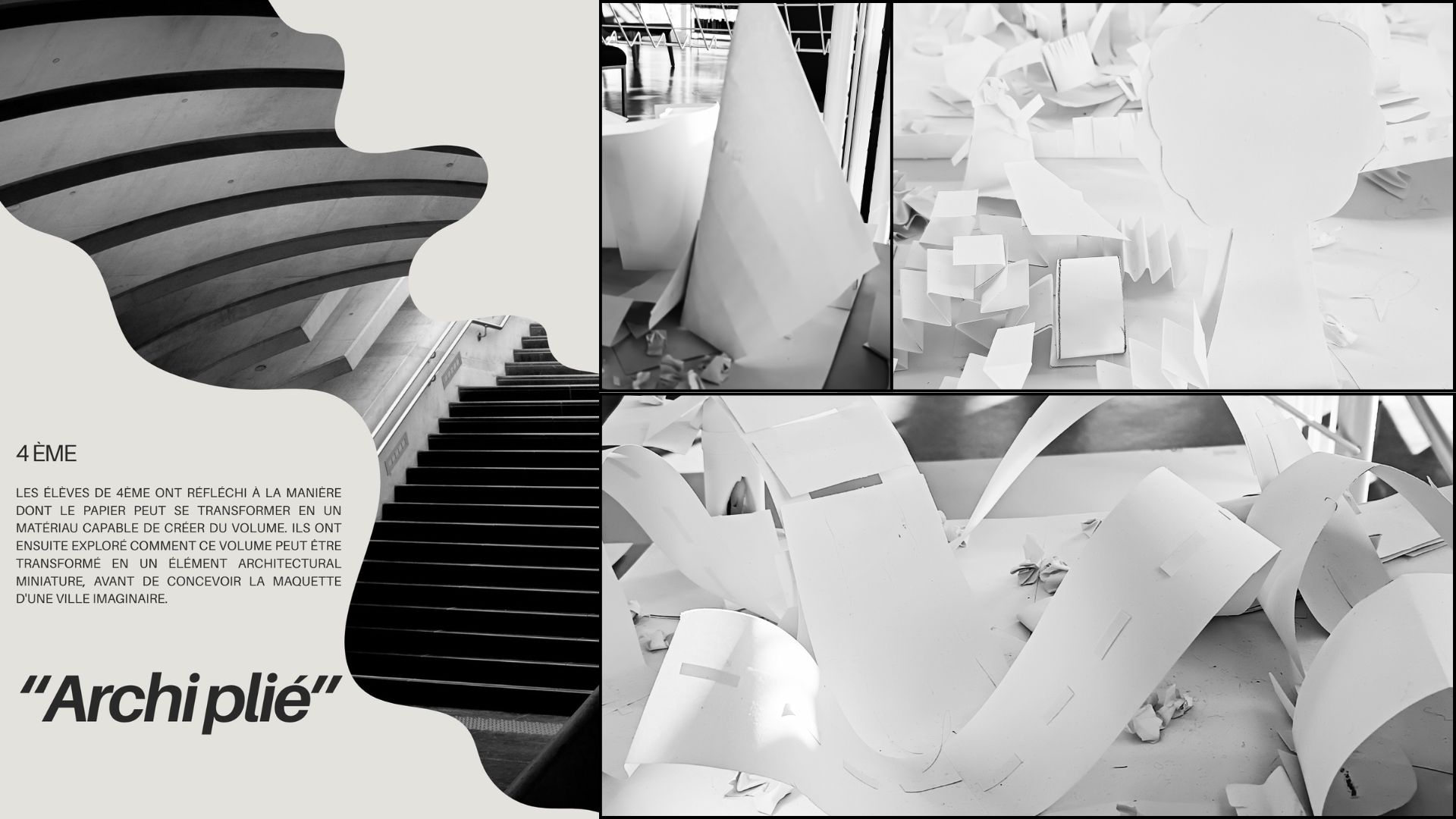 Les élèves de 4ème ont réfléchi à la manière dont le papier peut se transformer en un matériau capable de créer du volume. ils ont ensuite exploré comment ce volume peut être transformé en un élément architectural miniature, avant de concevoir la maquette d'une ville imaginaire.