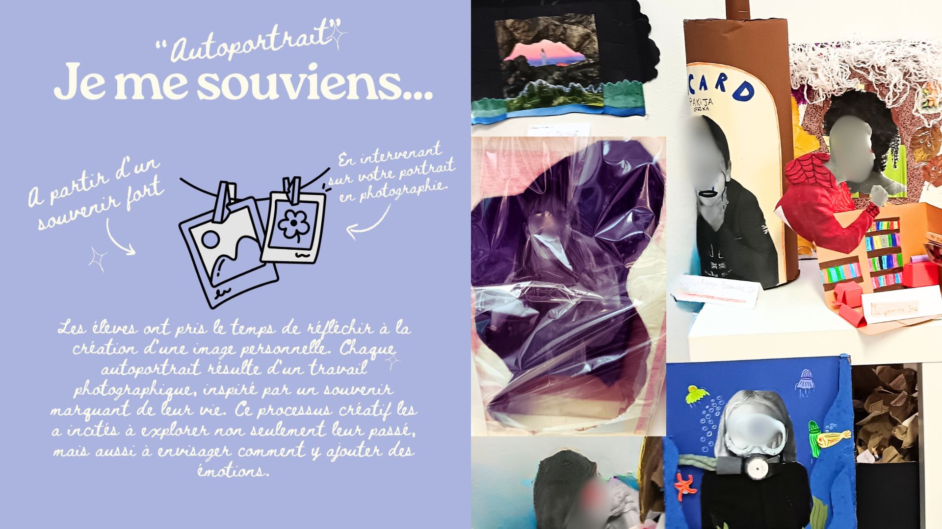 Les élèves ont pris le temps de réfléchir à la création d'une image personnelle. Chaque autoportrait résulte d'un travail photographique, inspiré par un souvenir marquant de leur vie. Les élèves ont pris le temps de réfléchir à la création d'une image personnelle. Chaque autoportrait résulte d'un travail photographique, inspiré par un souvenir marquant de leur vie. Ce processus créatif les a incités à explorer non seulement leur passé, mais aussi à envisager comment y ajouter des émotions.