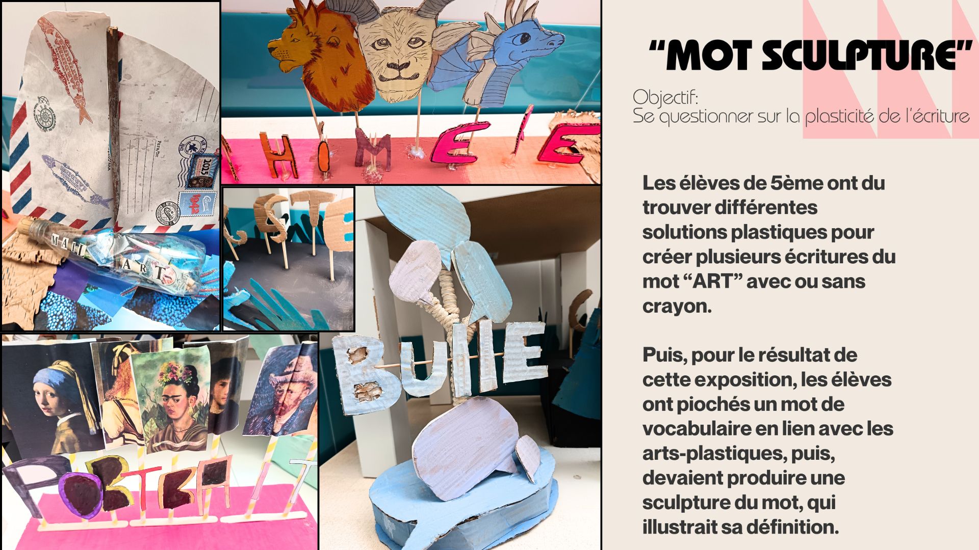 Les élèves de 5ème ont du trouver différentes solutions plastiques pour créer plusieurs écritures du mot “ART” avec ou sans crayon. Puis, pour le résultat de cette exposition, les élèves ont piochés un mot de vocabulaire en lien avec les arts-plastiques, puis, devaient produire une sculpture du mot, qui illustrait sa définition.